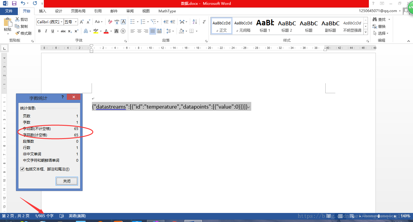 以上报文需要注意的是:第一行的设备ID29866262替换成你自己的设备ID;第二行设备的api-key替换成自己的设备api-key;第4行这个参数决定了你发送完这段报文之后是保持TCP继续连接还是断开连接。我第一次就是按照默认的close,结果数据只能上传一次,后来发现这个的时候,才醒悟过来,就把这行代码去掉了。就是说发送完一次数据之后,继续保持连接,因为实时数据会源源不断地上传,必须保持连接。第5行指的是第7行数据的长度,这个不允许出错,但是也不需要一个个数,在word文档里可以计数