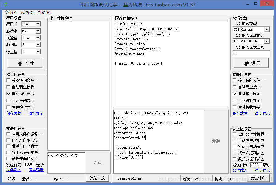 这些步骤要一步步落实,第4步“设置要连接的对方的IP地址和端口等属性”,设置的IP地址是OneNet公开协议接入指南http接入要连接到IP 183.230.40.34,端口80。使用Send()函数发送到指定上述地址的时候,要注意数据格式一定是按照规定的格式。
