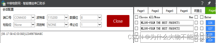 通过串口助手,可以看到模组已收到平台下发的数据123456789ABC,示例如下: