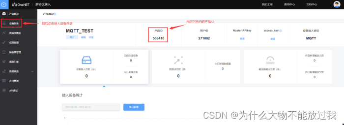 通过产品名“MQTT_TEST”进入产品概况界面,获取“产品ID”(示例为538410)如下,然后点击设备列表进入设备管理界面:
