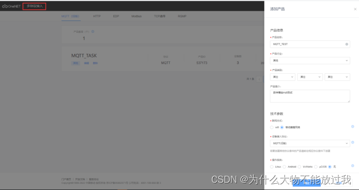 注册完OneNET后,点击进入OneNET“多协议接入”产品栏,在MQTT(旧版)界面下添加产品,任意输入产品名“MQTT_TEST”点击确认,示例如下: