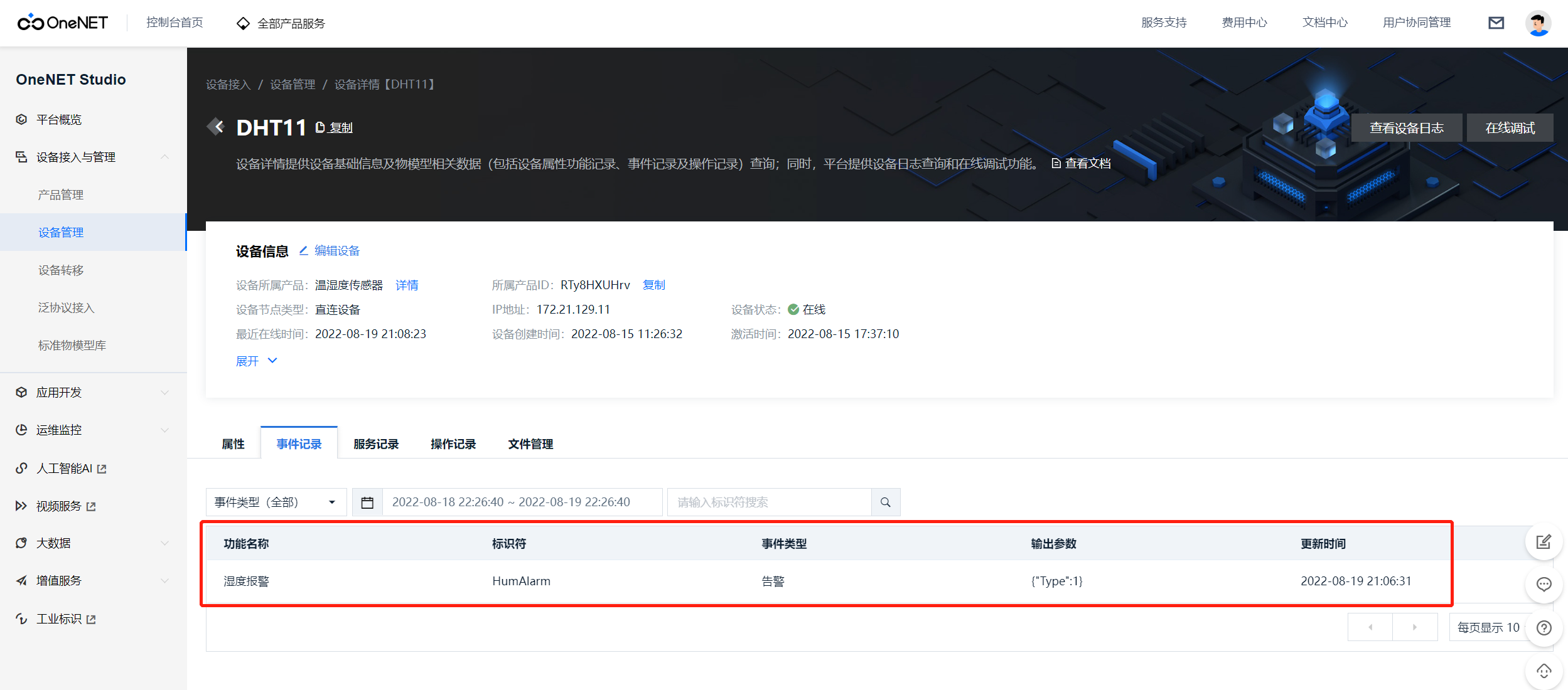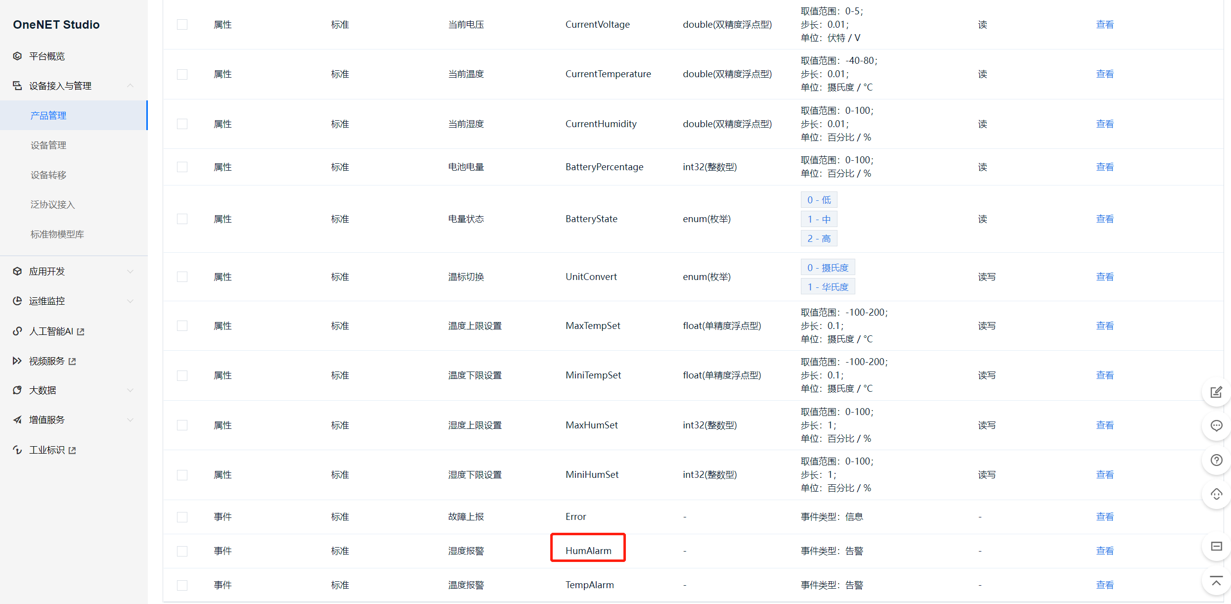 我们进入产品管理-详情页面,选择一个事件的标识符,如湿度报警 HumAlarm。