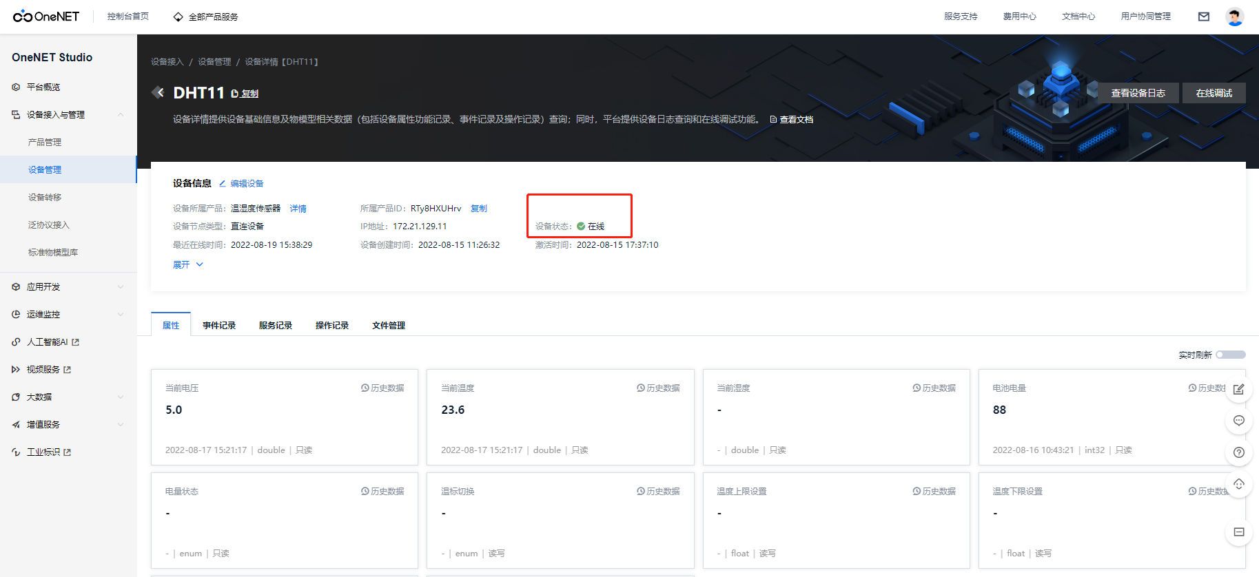 页面设备管理-设备详情,查看设备上报的属性数据。