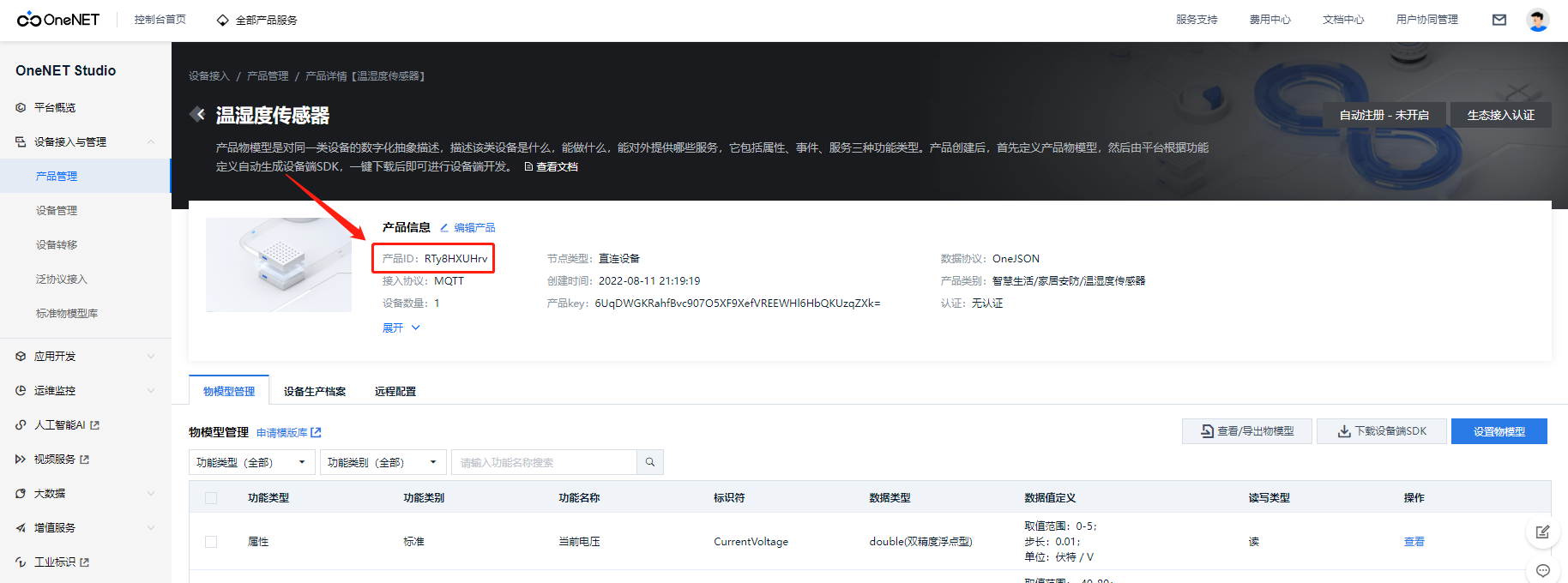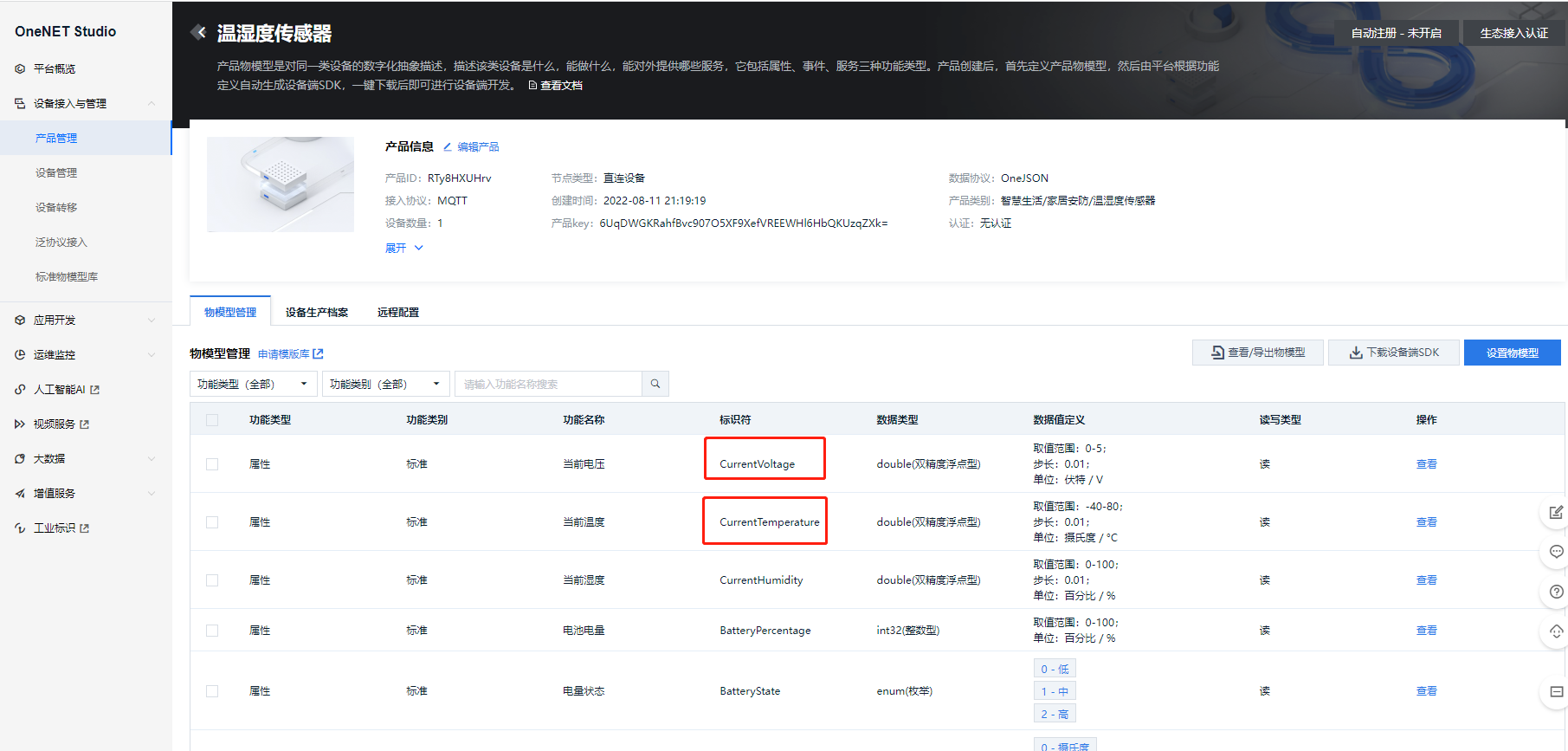 我们进入产品管理-详情页面,选择两个属性的标识符,如当前电压 CurrentVoltage 和当前温度 CurrentTemperature。