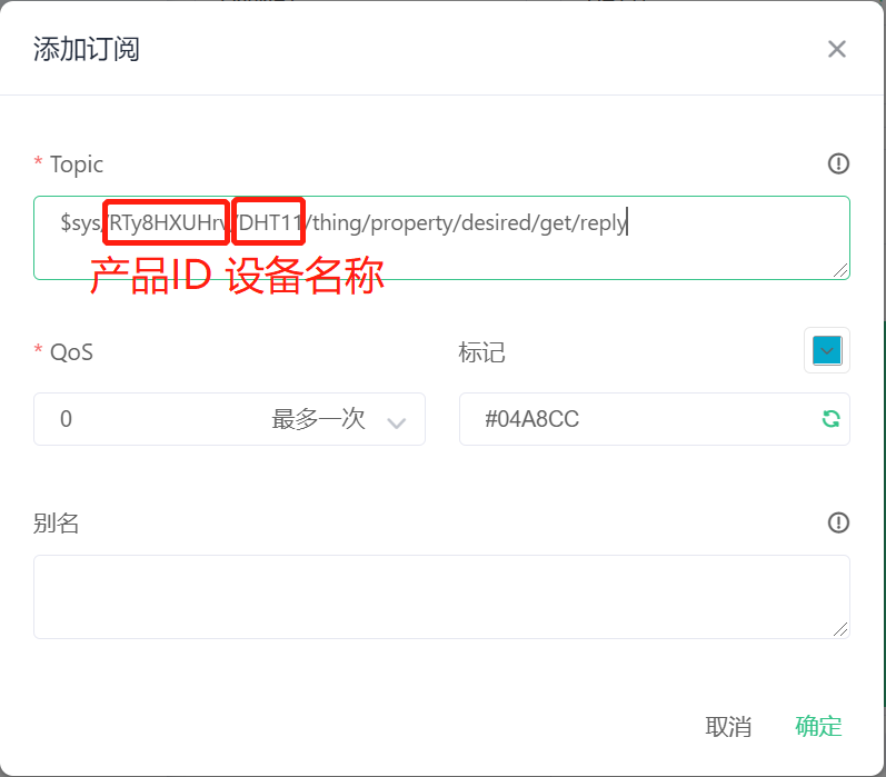 获取设备期望值的topic为:$sys/{pid}/{device-name}/thing/property/desired/get