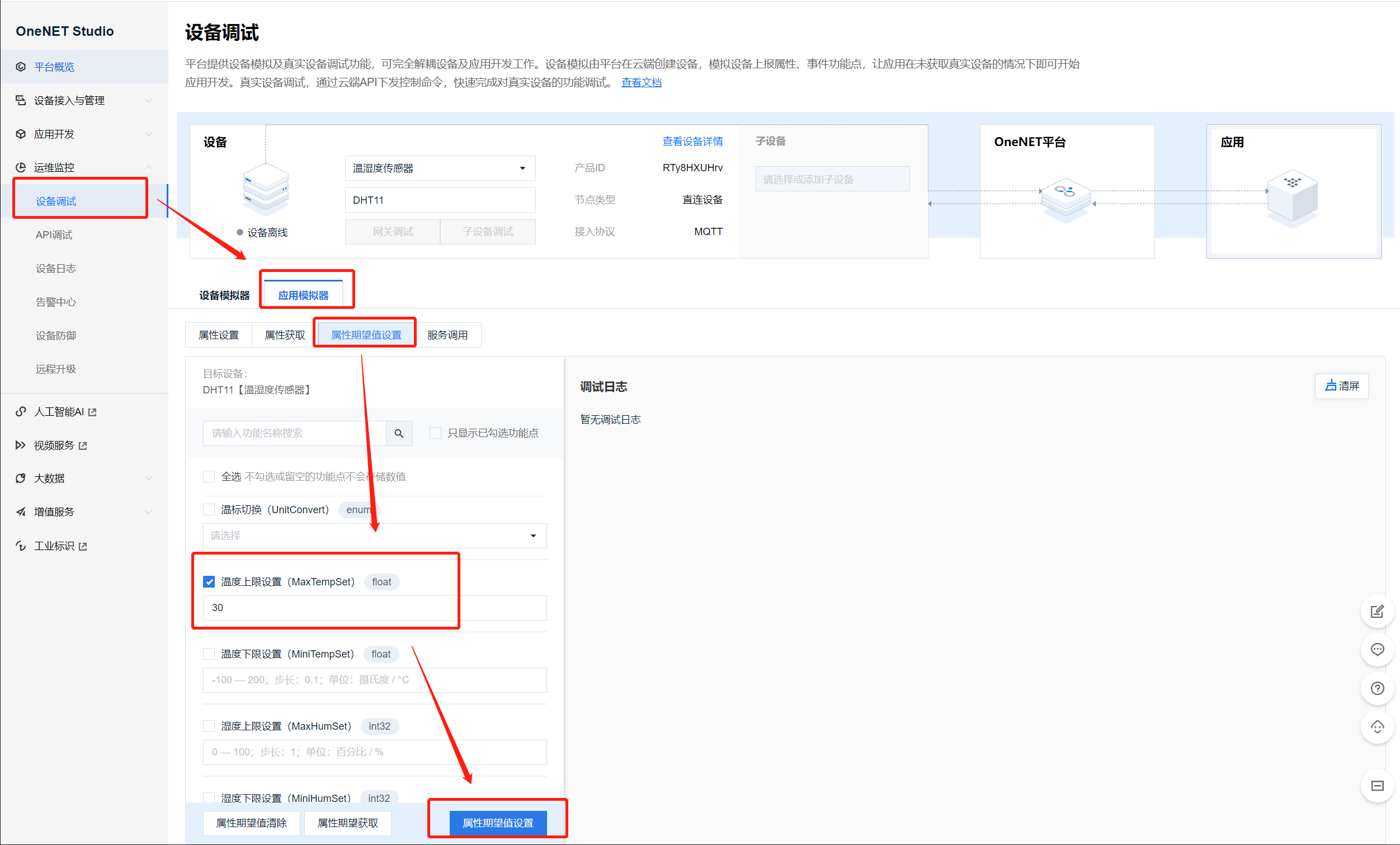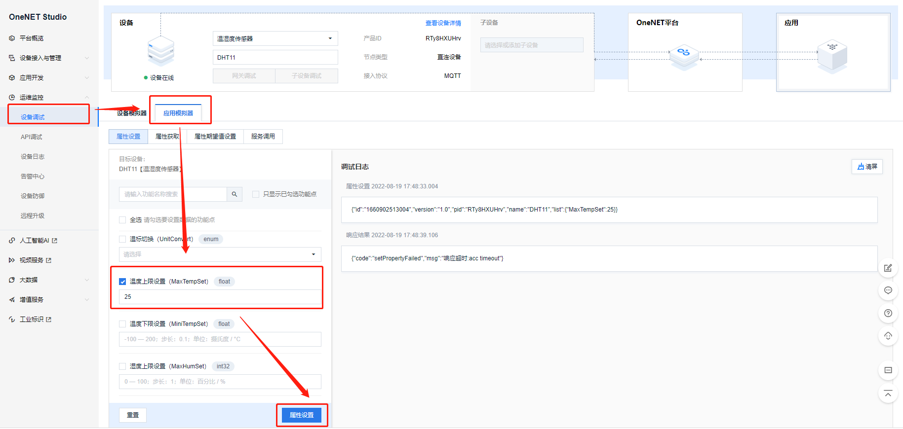 在页面运维监控-设备调试中-下行数据调试,可进行设置设备属性。