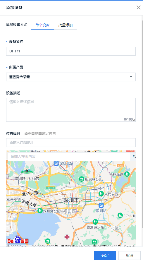 点击「添加设备」,选中单个设备(默认方式)输入设备详情,点击「确定」创建设备。