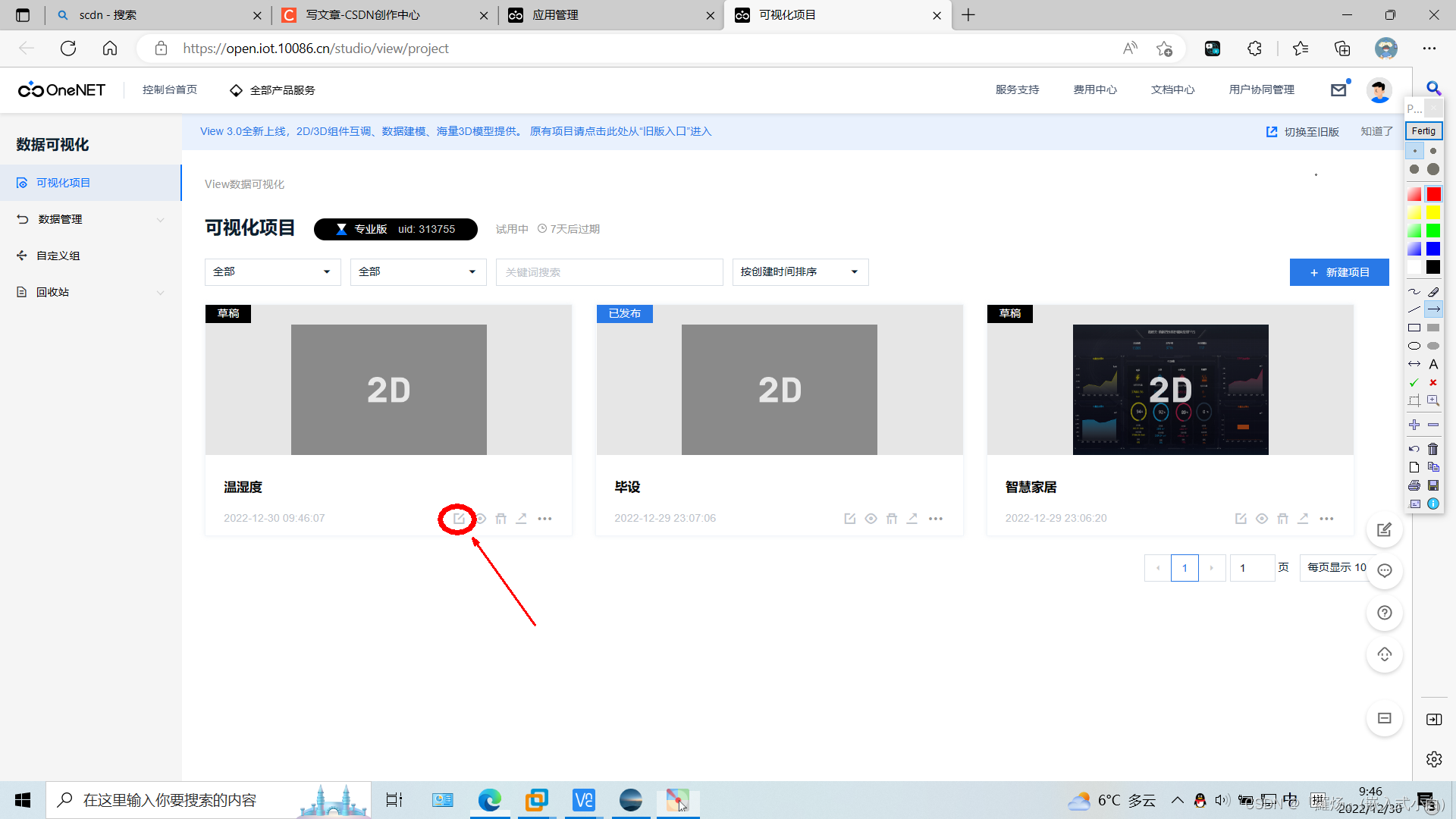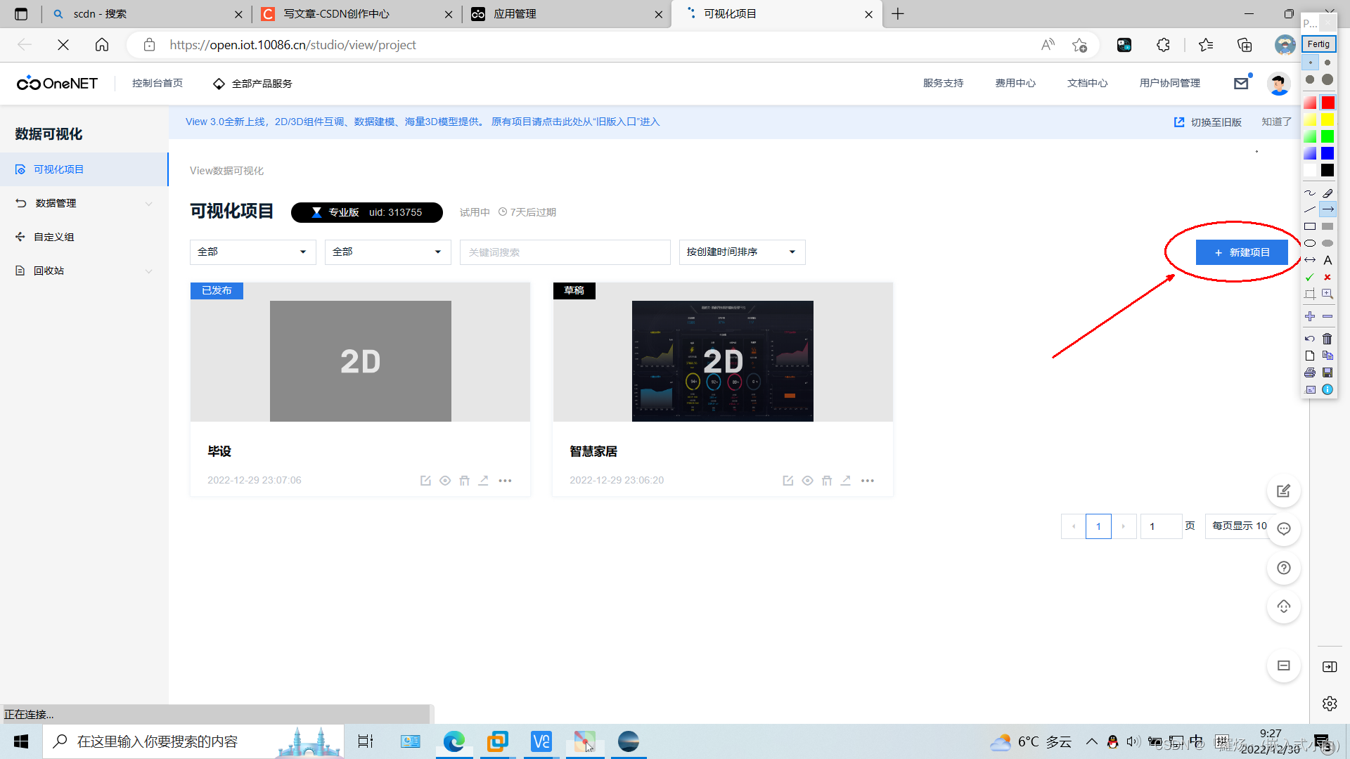 1.由于新版本onenet不能使用新增应用功能,只能使用数据可视化view。