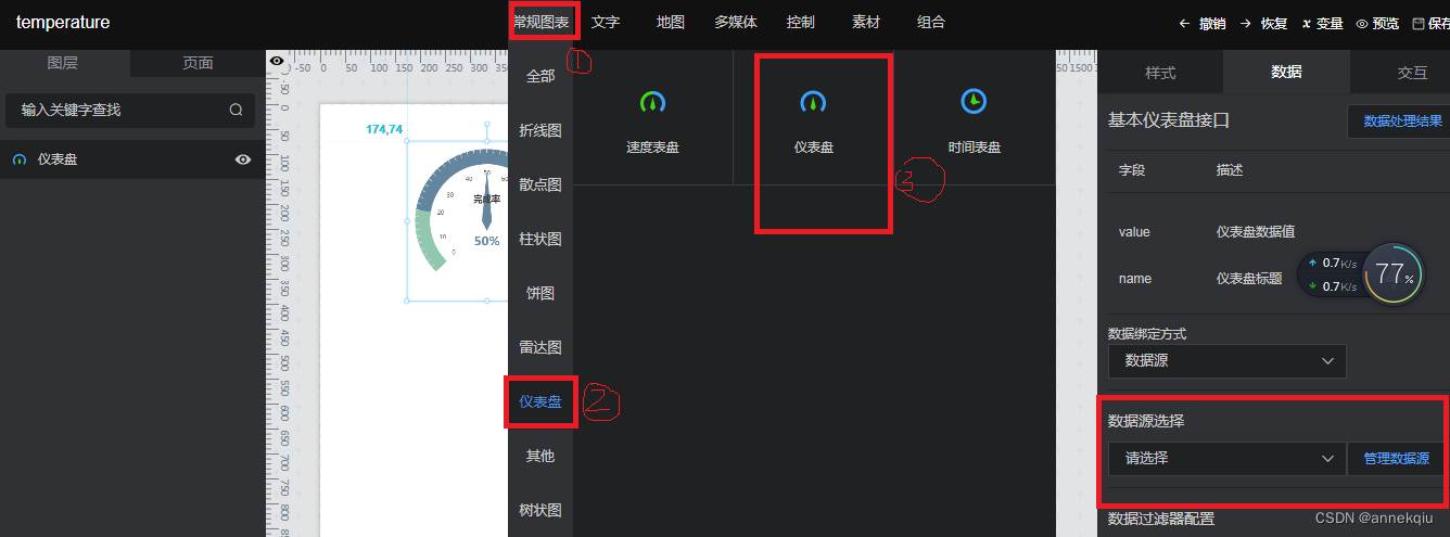 在画布上面添加仪表盘,具体操作参看如下界面的标示。