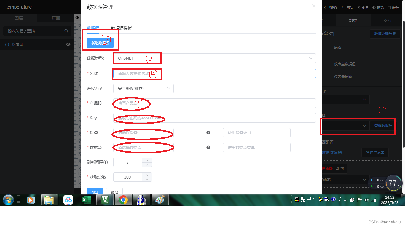 点击“数据”---〉“数据源选择”(目的:数据和控件关联关系),按照下图的步骤创建,其中数据类型--onenet,名称可任意设置,红色椭圆标记是参考前面“多协议接入”建立新产品时的产品ID,accesskey--来自产品概况(图示1),设备--来自设备列表的设备名称(图示1),数据流--来自数据流模板(图示1){控件功能是什么对应相关的数据流,比如:仪表盘--数据流为temperature,折线图--数据流为humidity,开关--数据流为ledFlag}。