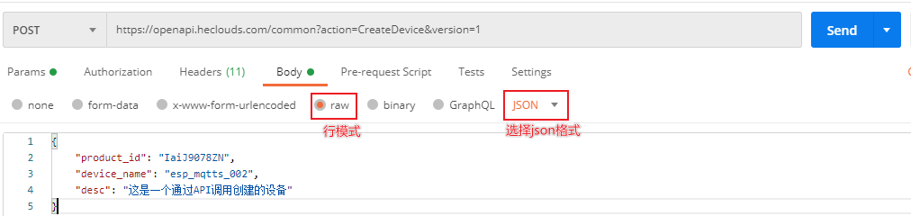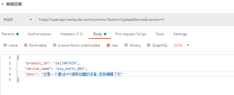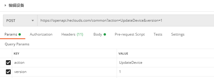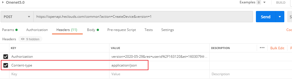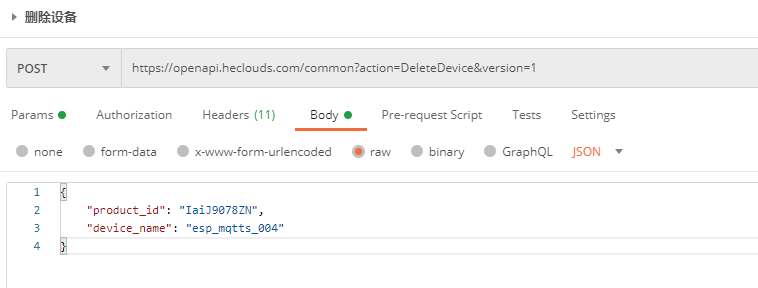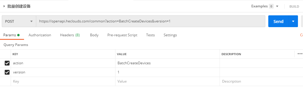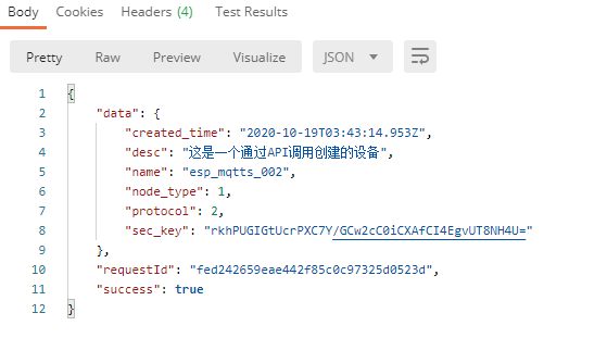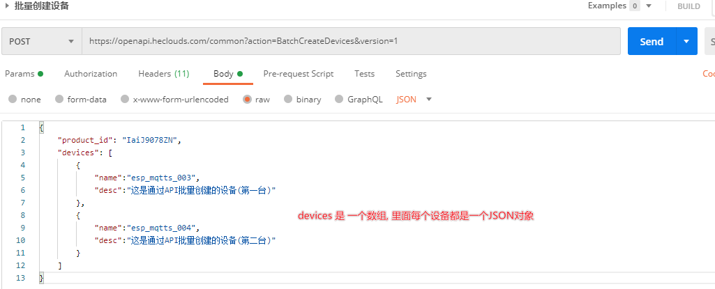 设备管理API 入口: https://open.iot.10086.cn/doc/iot_platform/book/api/common/createDevice.html 根据要求我们使用POST方法, 同时填写必要的action和version 然后, 我们要在请求头中设置Content-type为 application/json 然后,我们要在请求的body中设置Content内容: 关于JSON的内容, 非常易懂, 和API文档中的请求参数格式一致即可 我们send一下: 请求成功了 我们看一下设备列表: 成功! https://open.iot.10086.cn/doc/iot_platform/book/api/common/batchCreateDevice.html 和上一节基本一致, 不同只是在于body里的JSON格式 依旧POST 按上一节设置 content type 我们send 一下: 去设备管理界面验证一下: 依旧是POST请求 依旧修改BODY里的JSON 回复如下: 查询一下控制台: https://open.iot.10086.cn/doc/iot_platform/book/api/common/deleteDevice.html 前几步设置还是那样, 回复如下 的确删除了 查询设备详情API:https://open.iot.10086.cn/doc/iot_platform/book/api/common/queryDeviceDetail.html 首先, 这是一个GET请求, 所以,我们应该设置好基地址和get方法 然后,我们应该写入之前算好的token进行设备鉴权 然后, 根据API请求方法设置get的参数. 根据新版API调用格式, action 和 version是必须的 然后, 我们就收到了服务器的回复了!!https://openapi.heclouds.com/common?action=具体接口名称&version=1一. 创建设备
