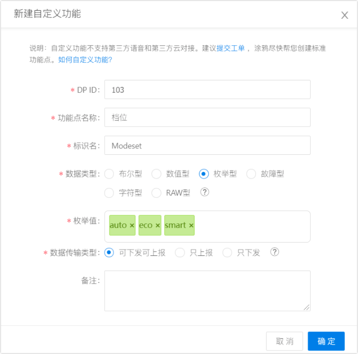 编辑功能点时,枚举值支持字母、数字和下划线。按回车键后,枚举值自动生成。枚举值编码从 0 开始,在硬件联调中以枚举值编码进行传输。每个枚举值长度不超过 15 字符,最多支持定义 10 个枚举值。