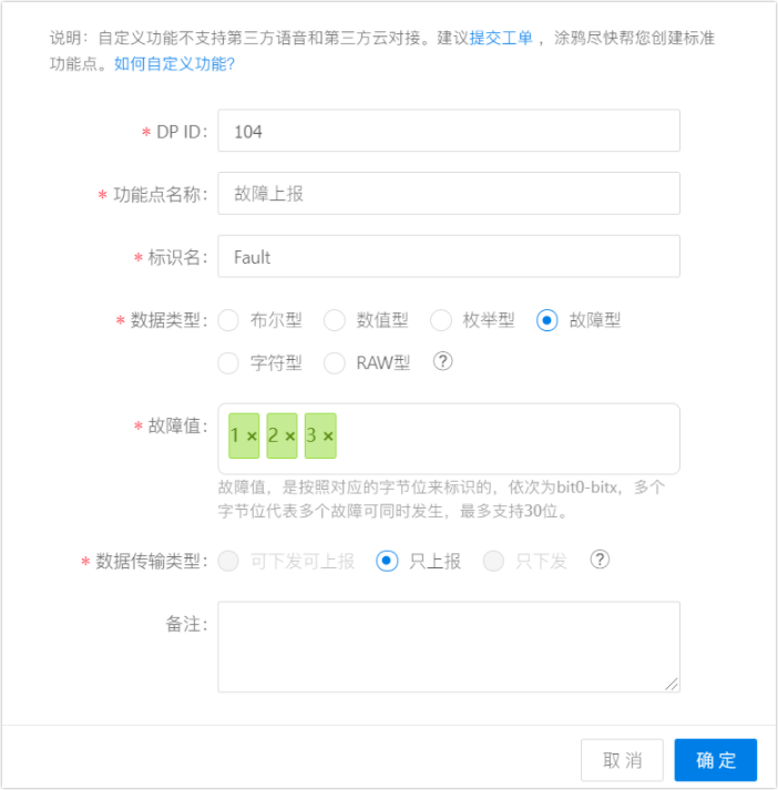 适用于上报和统计故障的功能点,支持多故障,数据只上报不下发。