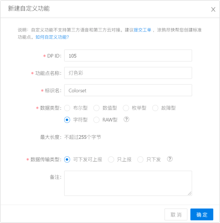 - 字符串型和透传型用于较复杂功能,只有当其他类型无法满足需求时,才推荐使用。