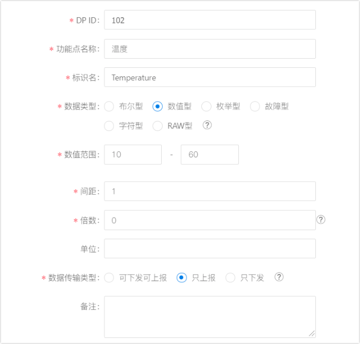 - DP ID:功能点的编码,设备与云端的功能数据通过功能点 ID 进行传输。前100个DP ID涂鸦保留使用,自定义DP点从101开始。