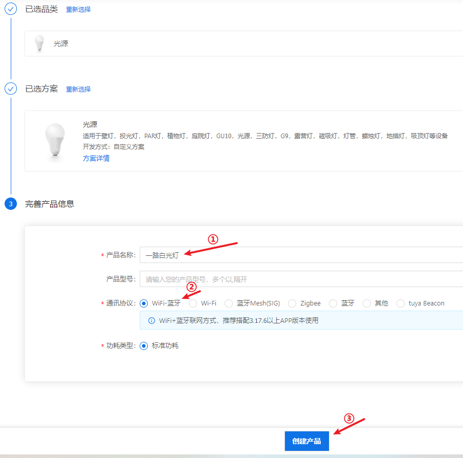 2.按照自己将要开发的产品和模组填写产品名称,选择对应的通信协议,配置完成后点击“创建产品”。