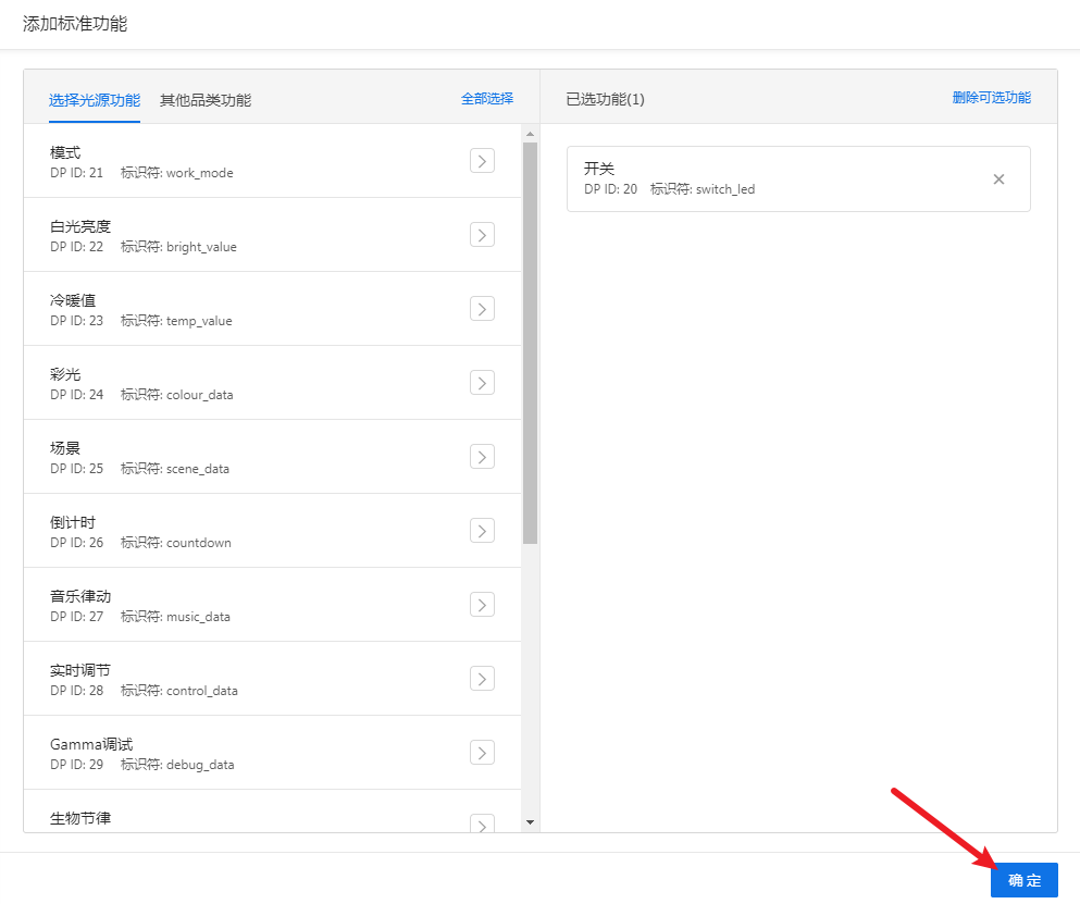 1.根据产品想要实现的功能,选择对应的功能点,选择完成后点击“确认”。