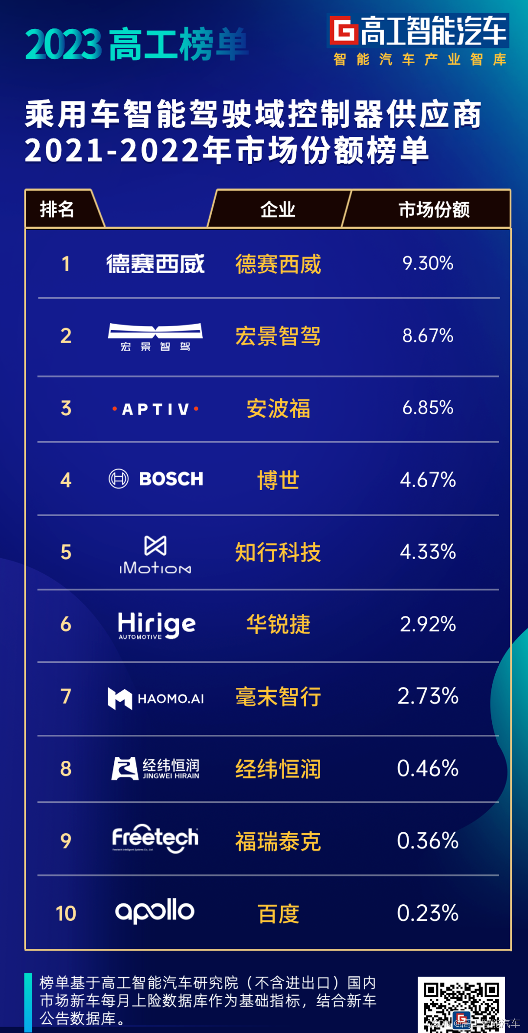 根据高工智能汽车研究院监测数据显示,以2021-2022年统计数据为口径,德赛西威、宏景智驾、安波福位列中国市场乘用车行车(含行泊一体)智驾域控制器供应商(不含代工)市场份额前三位。