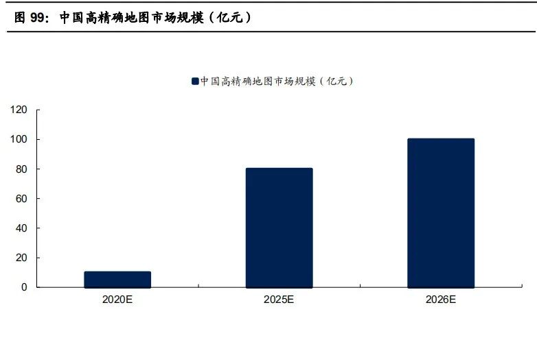 高精度地图产业有望快速发展。据盖世汽车研究院预测,2025年国内高精地图将近达到80亿元,2026年将会出现快速增长,突破100亿元。从竞 争格局来看,中国高精度地图市场集中度较高,2019年前三名分别为百度、四维图新和高德,CR3达68.9%。