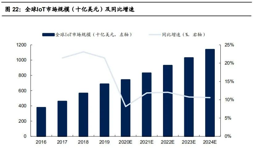 万物互联正在进行,市场快速发展。根据GSMA数据,2019年全球物联网连接数达到120亿,预计2025年达到246亿,年复合增速13%。据 Strategy Analytics,2019年全球物联网产值达到6860亿美元,2024年有望突破1.1万亿美元,CAGR达到10.7%。不同的主流咨询机构口径不同, 但对未来都给了很高的期待。根据我们的观察,物联网的发展速度有望超越大家的普遍预期,未来5年复合增速达到15%的水平,是增长最快的 硬件科技赛道之一。