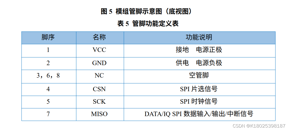 CI24R1小模块(内置天线)共接出 8 个管脚,如管脚示意图,管脚功能定义表是接口定义。