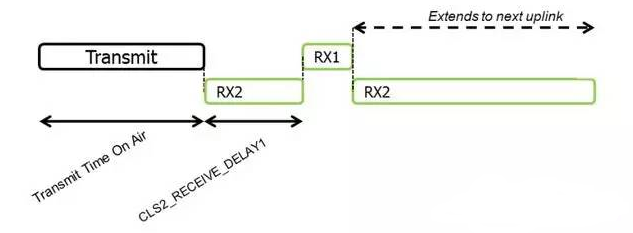 这是Class A 上下行的时序图,目前接收窗口RX1一般是在上行后1秒开始,接收窗口RX2是在上行后2秒开始。