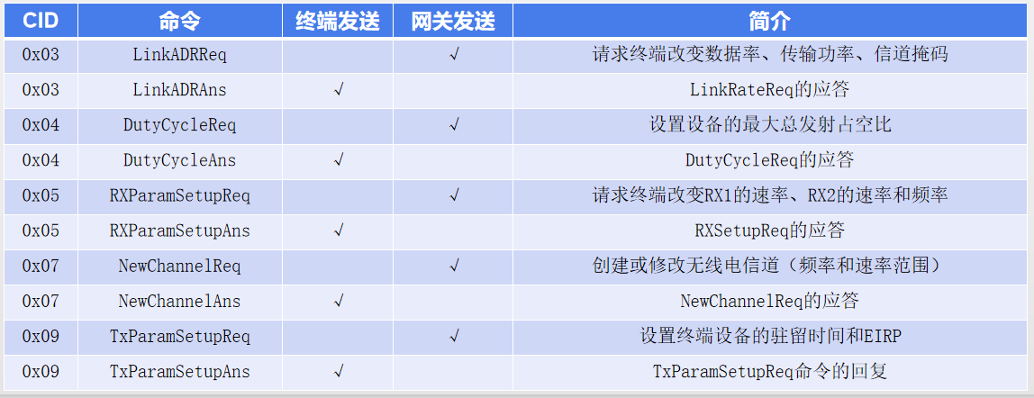 一条MAC命令由一个字节的命令ID(CID)和特定的命令序列组成,命令序列可以是空。常见命令如下表所示