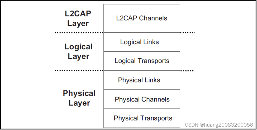蓝牙数据传输架构采用分层结构,核心分为三层:L2CAP层、逻辑层、物理层。