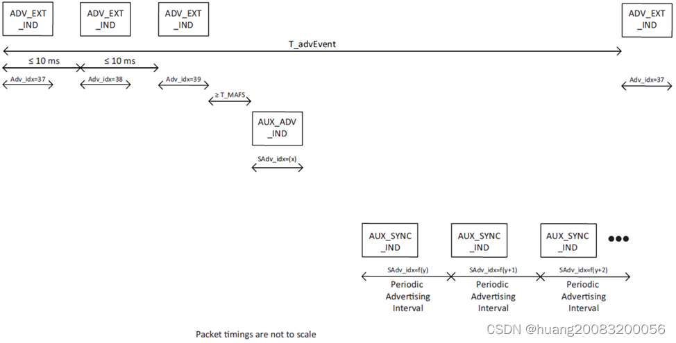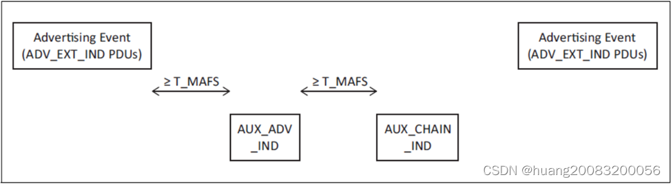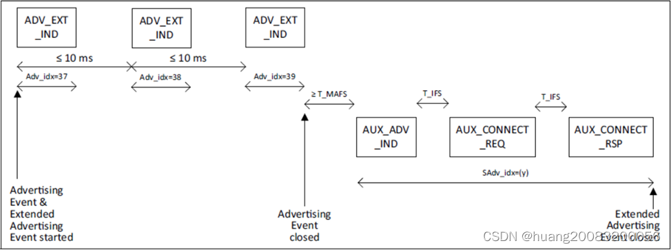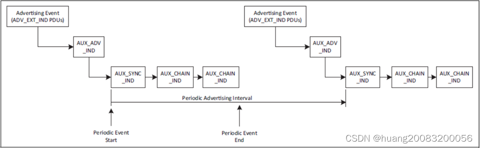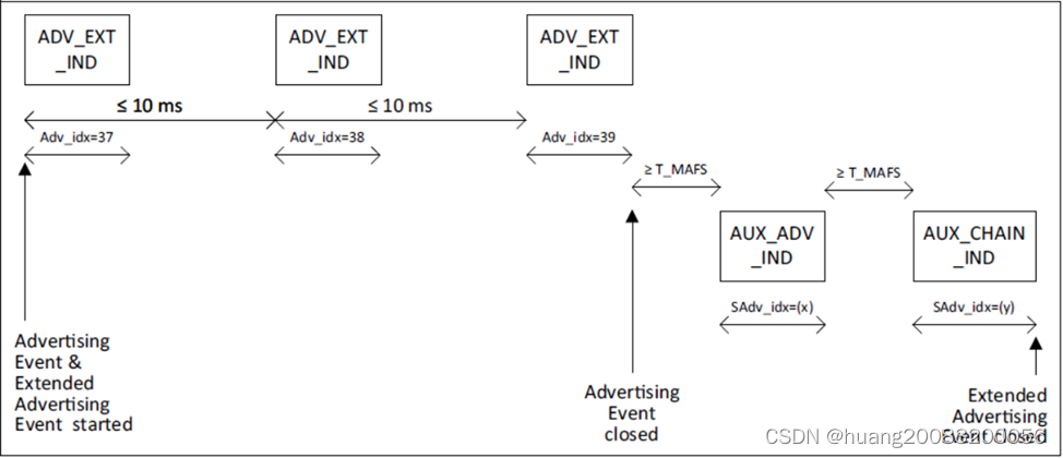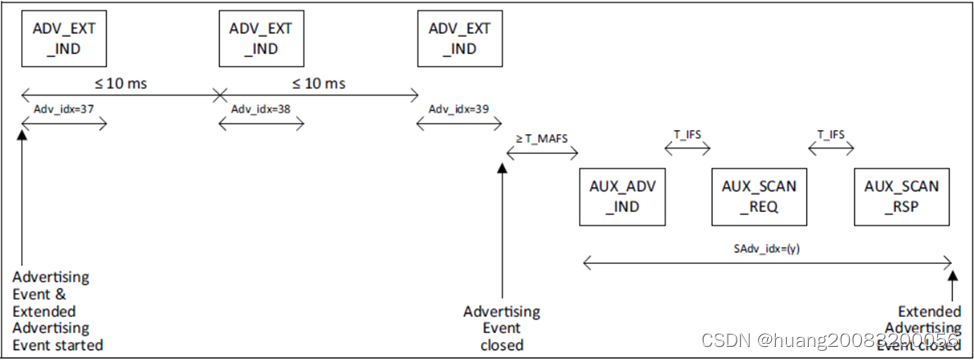 扩展广播事件开始于ADV_EXT_IND PDU,结束于最后一个扩展广播PDU,如AUX_ADV_IND、AUX_CHAIN_IND。