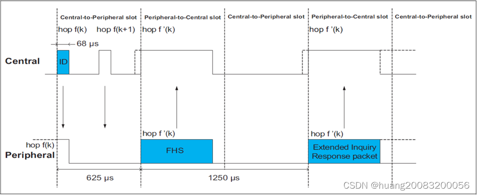 从设备在查询扫描状态监听查询ID包,每个跳频点监听一定的时间,若未监听到查询ID包,则跳到下一个频点进行监听,如果接收到查询ID包,则进入查询响应(inquiry response)状态,回复FHS包给主设备。FHS包中包含蓝牙地址、本机时钟以及其它设备信息,共144位信息,加上16位CRC,通过2/3前向纠错编码,总包长为240位。