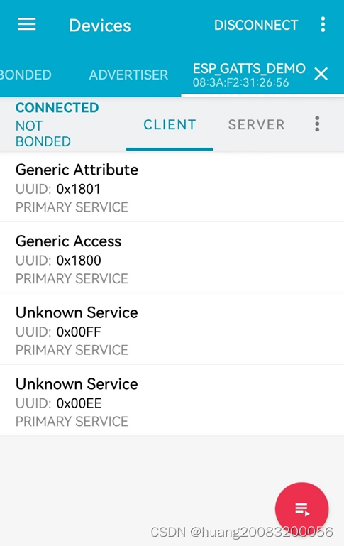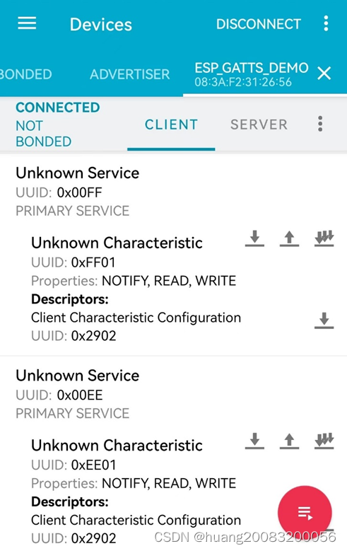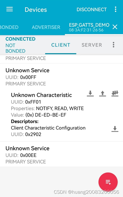点击连接后,可以获取gatt server支持的服务uuid,其中0x00EE以及0x00FF为自定义uuid。