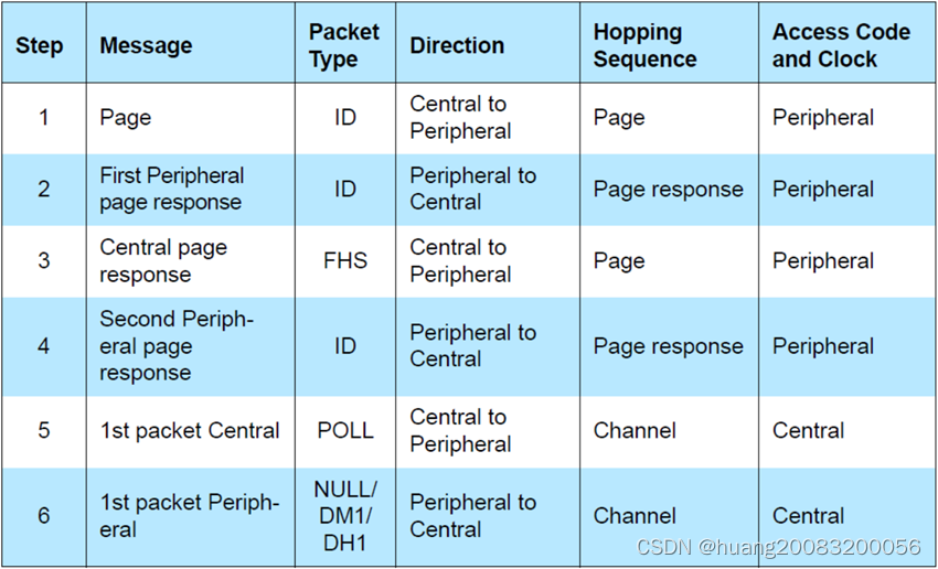 从设备在寻呼扫描(page scan)状态监听寻呼ID包,每个跳频点监听一定的时间,若未监听到查询ID包,则跳到下一个频点进行监听,如果接收到寻呼ID包,则进入寻呼响应(page response)状态,回复第一个ID包给主设备。主设备收到第一个回复ID包后,发送FHS包给从设备,FHS包中包含主设备蓝牙地址、本机时钟等信息。从设备接收到FHS包后,根据主设备的蓝牙地址,时钟信息,产生通道接入码以及对应的跳频序列,从设备回复第二个ID包给主设备后,进入连接(connection)状态。主设备收到第二个回复ID包后,产生通道接入码以及对应的跳频序列,进入连接状态,并按通道接入码发送第一个POLL包确定是否有效连接。从设备可响应NULL/DM1/DH1包给主设备,从而完成连接过程。