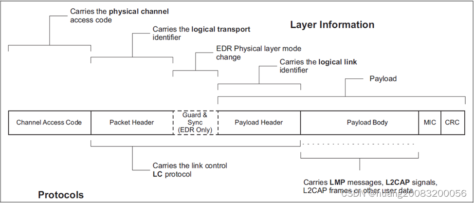 BR/EDR包可以分成三部分:接入码(Access Code)、包头(Packet Header)和载荷(Payload)。这三部分并非紧耦合,包可以只有接入码部分(如ID包),也可以只有接入码和包头部分(如NULL包、POLL包),能确定的是每个包都至少包含接入码。