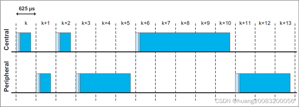 蓝牙信道划分为时隙,每个时隙时间长度为625us,最大跳频速率为每秒1600跳。连接后,根据数据包的长度,可以分为单时隙包(占用1个时隙)、3时隙包(占用3个时隙)、5时隙包(占用5个时隙)这三种包类型。主设备(Central)总是从偶时隙开始发送数据,从设备(Peripheral)总是从奇时隙发送数据。