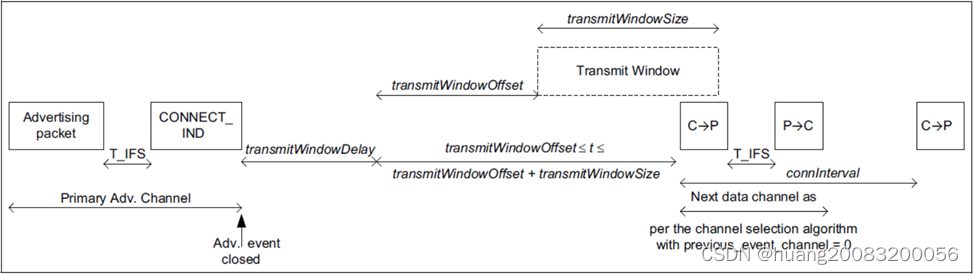 3) 对于可被连接的广播报文ADV_IND或ADV_DIRECT_IND,在发起状态下满足条件的接收设备可以在主广播频道发起连接请求CONNECT_IND,并进入连接状态。