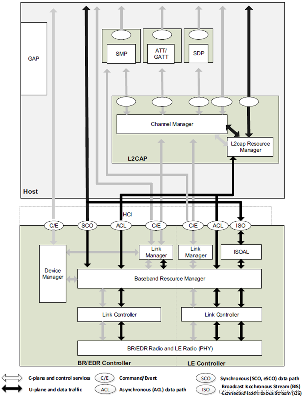 蓝牙可分为控制器(Controller)和主机(Host)两部分,它们之间彼此独立,通过HCI接口以及协议通信。控制器包括了射频PHY、链路控制(Link Controller)、基带管理(Baseband Resource Manager)、链路管理(Link Manager)、设备管理(Device Manager)等物理部分,实现蓝牙无线发射接收、包编码解码、收发时序管理、链路连接管理等等功能。BR/EDR主机至少包括了L2CAP、SDP、GAP规范,而LE主机至少包括了L2CAP、SMP、ATT/GATT、GAP规范,从而可以向应用层提供基础的接口,方便应用层对蓝牙系统的访问。