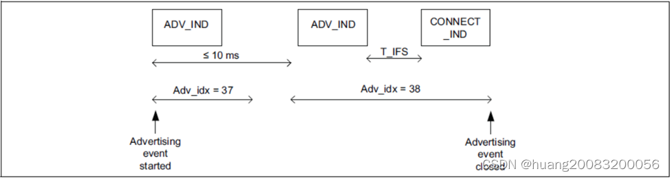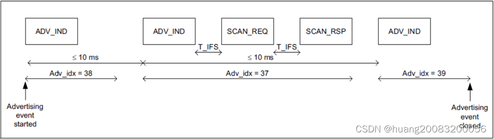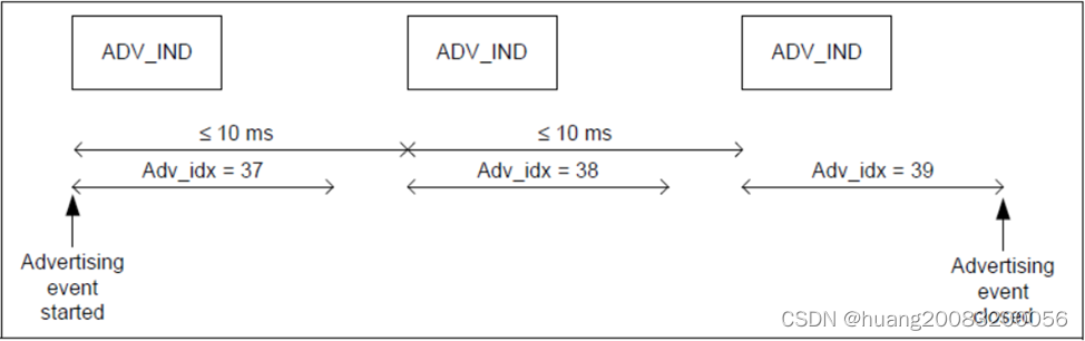 设备每次广播时,通常依次在每个主广播频道(37、38、39)发送相同的报文,这些报文被称为一个广播事件。