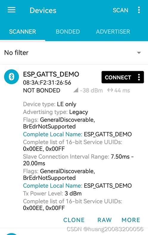 烧录并运行gatt_server例程代码,手机端安装BLE蓝牙调试程序nRF Connect,打开蓝牙并进入APP,可以发现BLE蓝牙广播信息。