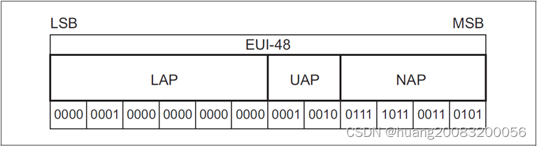 每个蓝牙设备有一个48位唯一的蓝牙设备地址(BD_ADDR),其中低24位地址称为LAP (Lower Address Part),中间8位地址称为UAP (Upper Address Part),高16位地址称为NAP (Non-significant Address Part),UAP和NAP由IEEE分配给不同的厂商,LAP由厂商内部自由分配。