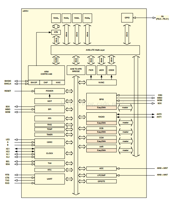 nRF51 SDK提供外部软件支持蓝牙低功耗和2.4G特有应用。宽电压供电2.1-3.6V供电。