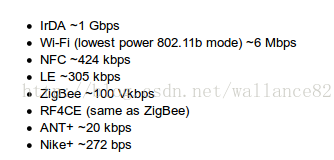 3. ZigBee 基于IEEE802.15.4,主要针对smart meters, home automation和remote control ,也有节能及睡眠机制,信道带宽2MHz,但间隔5MHz,所以频谱不如BLE高效,抗干扰能力不如BLE和ANT,所以不能跟WiFi共存,而BLE可以
