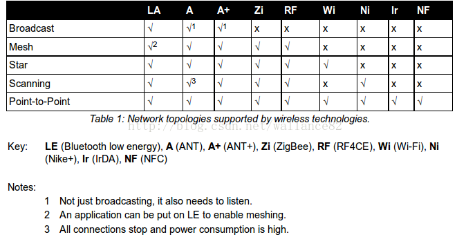 1. BLE(BlueTooth Low Energy) 最先有诺基亚发起(膜拜一下Nokia),也被成为BlueTooth v4.0,已经成为标准,BLE与用来连接耳机和手机的老式蓝牙一样, 采用2.4GHz 频率,不同之处在于蓝牙LE 是进行间歇通信。它不像老式蓝牙那样一直保持连接状态,而是 仅连接数毫秒至数秒,在执行完通信后立即断开连 接,进入睡眠模式,由此来实现省电力化。使用frequency hopping跳频技术