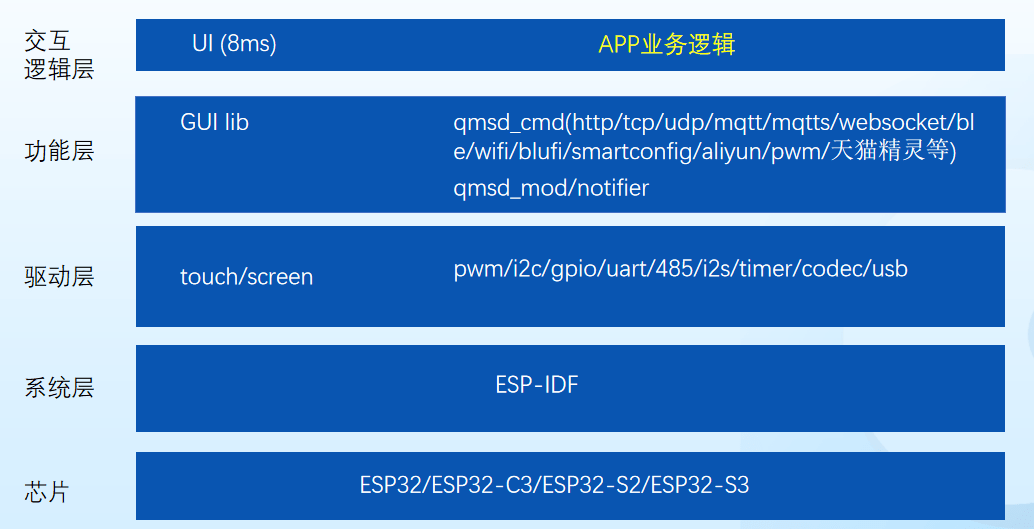 和UI相关的代码可以添加至 {sdk_dir}/components/qmsd_ui/ui/qmsd_internal_ui_cb.c中的各控件的回调函数中,也可以借助8ms的自定义回调将时间参数传递至{sdk_dir}/main/control/qmsd_ui_cb.c 中的qmsd_ui_cb中进行处理。值得注意的是这些函数正常情况下只会运行在GUI线程中,在这些函数中添加耗时或阻塞任务会导致UI性能下降或卡顿。