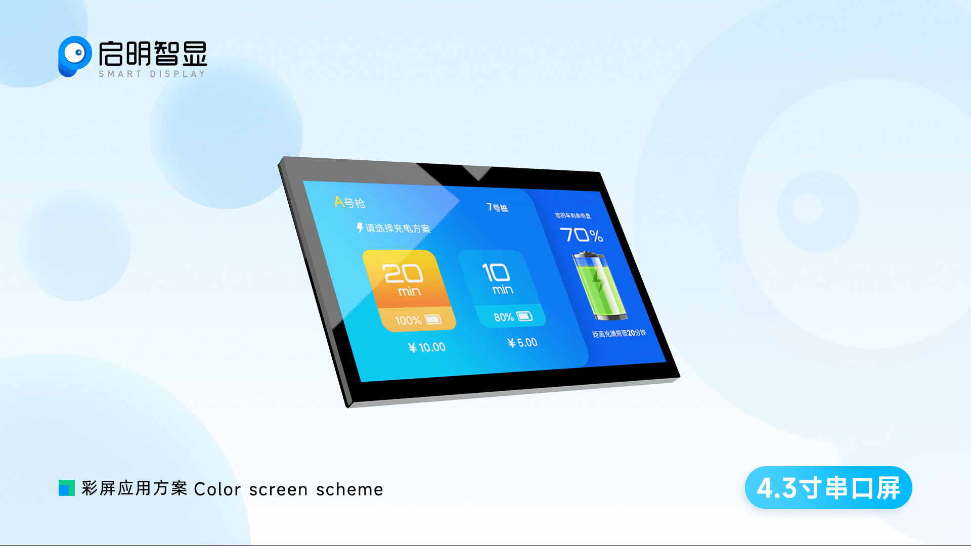 ZX4D30NEO1S智能串口屏选用4.3寸分辨率为 480(RGB)×272 全视角IPS工艺彩屏,能够实时显示二维码、充电量、充电剩余时间、输出功率、使用时间、以及异常警报提示,充电使用情况随时掌握,让充电变得更安全;硬件集成WIFI、蓝牙、RS485、串口等,支持OAT远程快速升级;支持通过串口外接刷卡器;