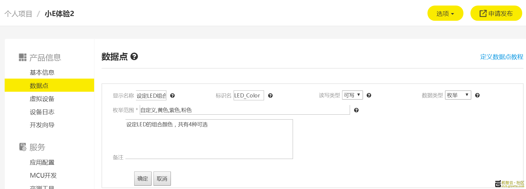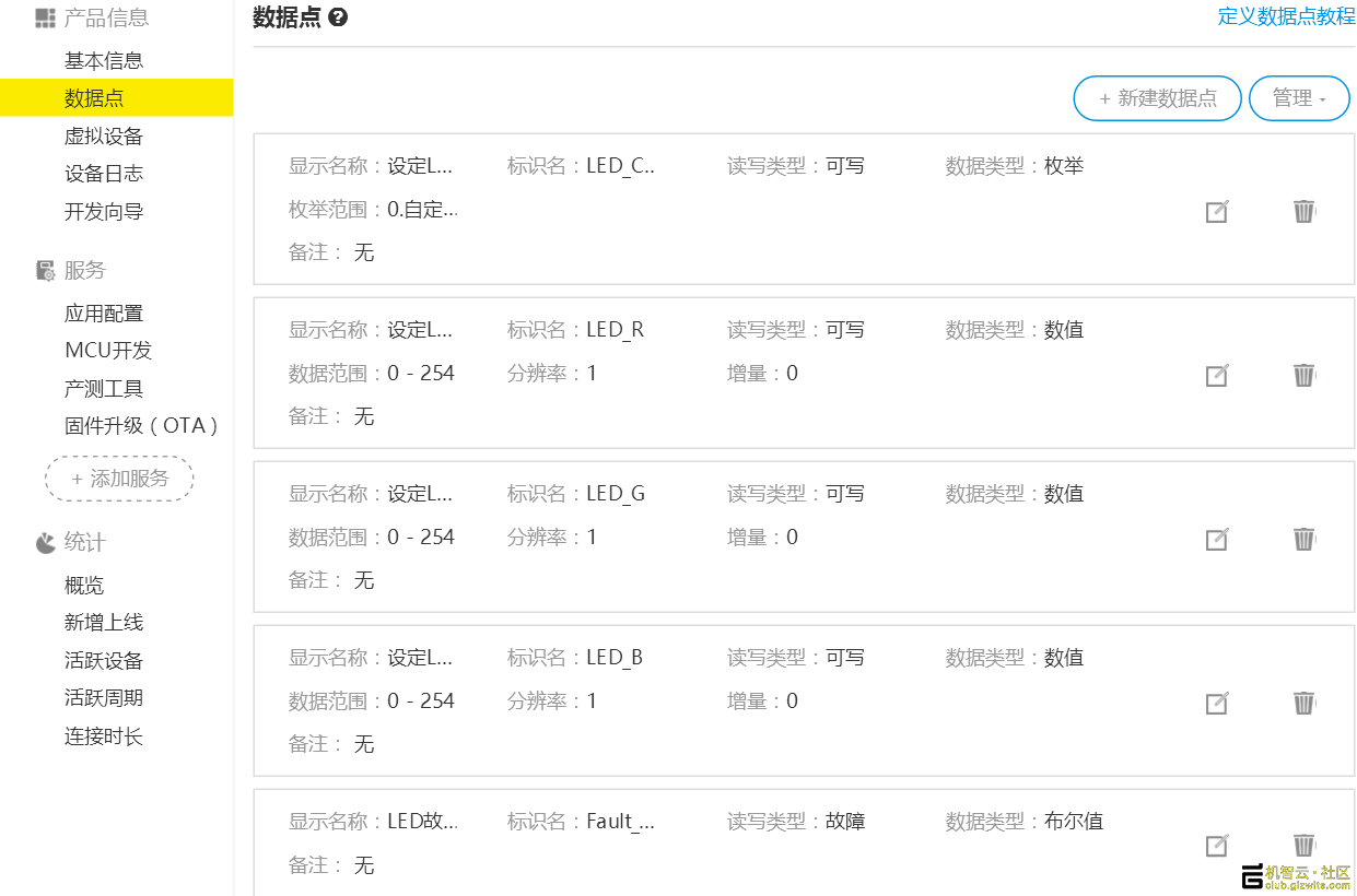 数据点即设备产品的功能的抽象,用于描述产品功能及其参数。创建数据点后,设备与云端通讯的数据格式即可确定,设备、机智云可以相互识别设备与机智云互联互通的数据。