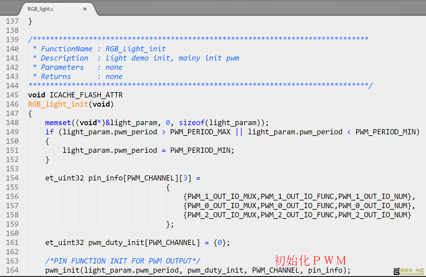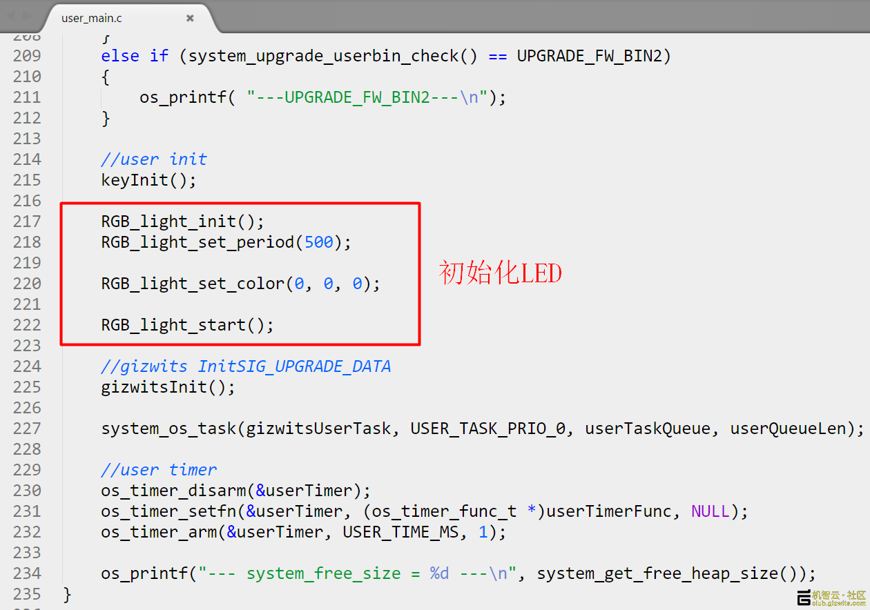 然后在void ICACHE_FLASH_ATTR user_init(void)函数调用RGB LED初始化: