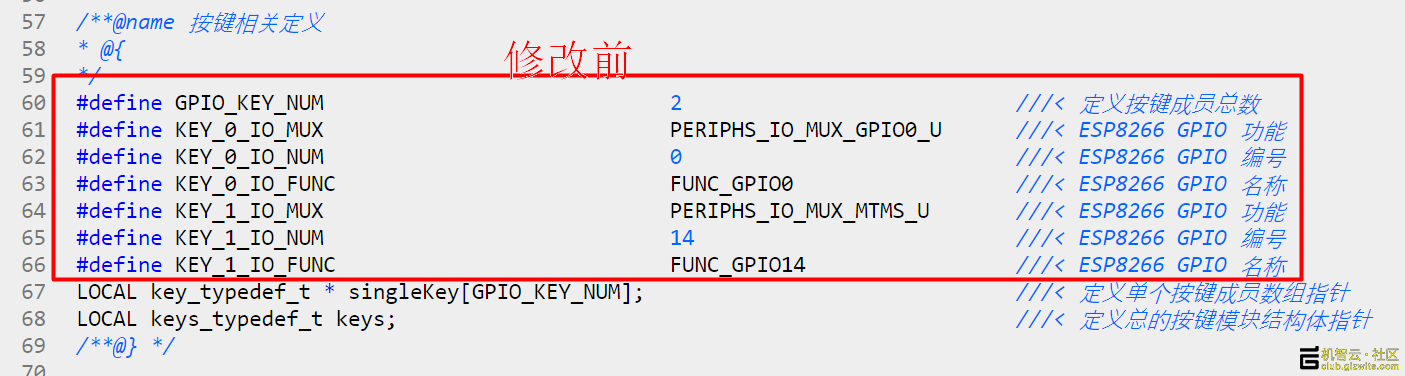 接下来修改按键,这个按键的作用是触发小E进入联网模式,配合手机APP获取路由器的SSID和密码。由于生成的工程包含的按键驱动是以机智云官方Gokit3 SOC版为模板的,我们小E的按键连接的管脚和Gokit是不一样的,因此需要修改。