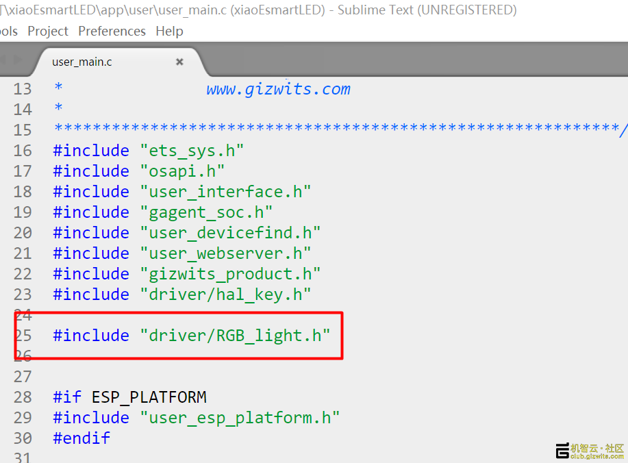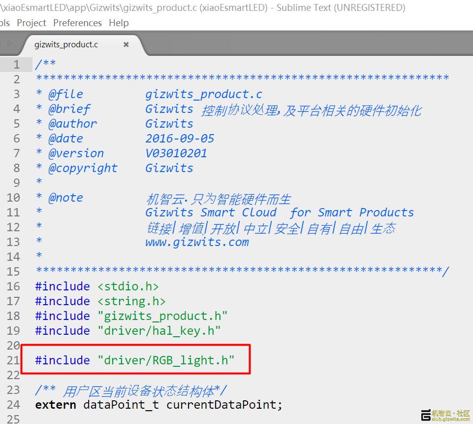 最后一步是在xiaoEsmartLEDappGizwits里的gizwits_product.c文件中添加业务逻辑,本例就是MCU收到手机APP的对应指令后执行PWM输出对应值动作。首先是包含驱动头文件: