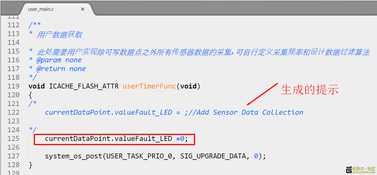User_main.c中还有一个userTimerFun定时回调函数,这里可依据数据点添加信息,例如本例增加了RGB LED故障上报,当然填充值为0,因为实际并没有去检测的LED的好坏。