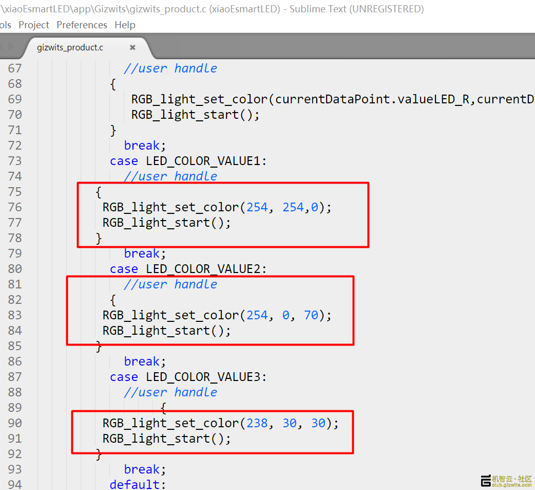 int8_t ICACHE_FLASH_ATTRgizwitsEventProcess(eventInfo_t *info, uint8_t *data, uint32_t len),在里面如下位置添加对应代码: